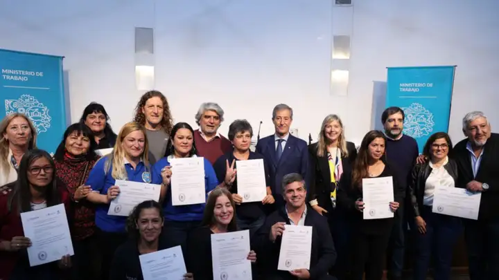 El ministro de Trabajo, Walter Correa, y la jefa de Asesores del Gobernador, Cristina Álvarez Rodríguez, entregaron este martes certificados a las y los egresados de las diplomaturas universitarias para la Formación Sindical, que se dictaron en la Universidad Nacional de San Martín.