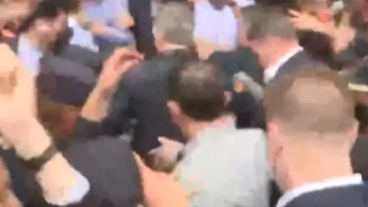 El exmandatario pasó por delante de un cronista de C5N y le golpeó el micrófono, tal como se pueden ver en las imágenes que aparecen en el video.