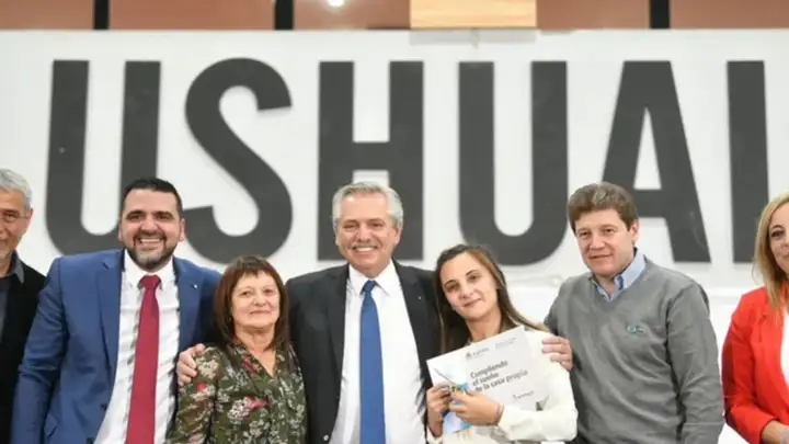 El presidente Alberto Fernández encabezó este viernes la entrega del crédito Pro.Cre.Ar número 50 mil para la adquisición de viviendas en la ciudad de Usuhaia junto a a funcionarios nacionales y el gobernador Gustavo Mellela.