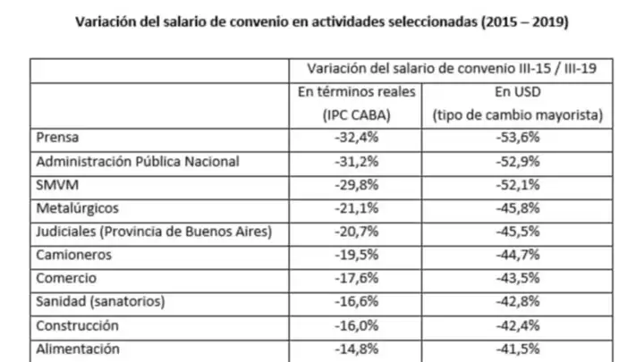 Un informe muestra que algunos gremios perdieron más de 30 puntos de valor adquisitivo de sus salarios por la suba de la inflación y los bajos acuerdos de paritarias. El resultado muestra los problemas que atraviesa la clase trabajadora que además padeció los cierres de fábricas y la suba del desempleo.