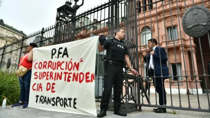 El efectivo, que asegura estar cobrando $700.000, lo que lo obliga a hacer otros trabajos para sobrevivir, se encontraba uniformado y portaba el arma de servicio. Además, llevaba una pancarta con la que denunciaba corrupción en la Superintendencia de Transporte. Tras la acción, efectivos de seguridad conformaron un cordón policial, entre ellos quienes intentan convencerlo de que deponga su actitud. “PFA corrupción Superintendencia de Transporte”, decía la pancarta que sostenía.