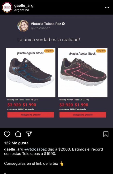 La marca de zapatillas Gaelle, tomó este contexto para lanzar su nueva línea de calzado económico y publicó los calzados a tan sólo $1990.