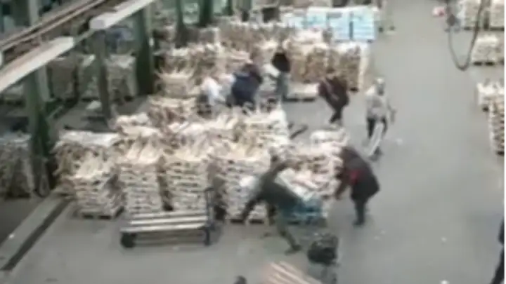 Acto seguido, otro de los trabajadores del lugar tomó un pallet que revoleó impactando en la espalda y en la cabeza del delincuente, quien una vez ya en el suelo recibió un par de patadas y golpes de puño.