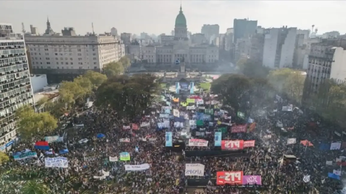 La movilización, que desde temprano colmó la Plaza del Congreso, había sido convocada por gremios docentes, la Federación Universitaria Argentina (FUA), sindicatos y organizaciones sociales, a la espera de una votación clave.